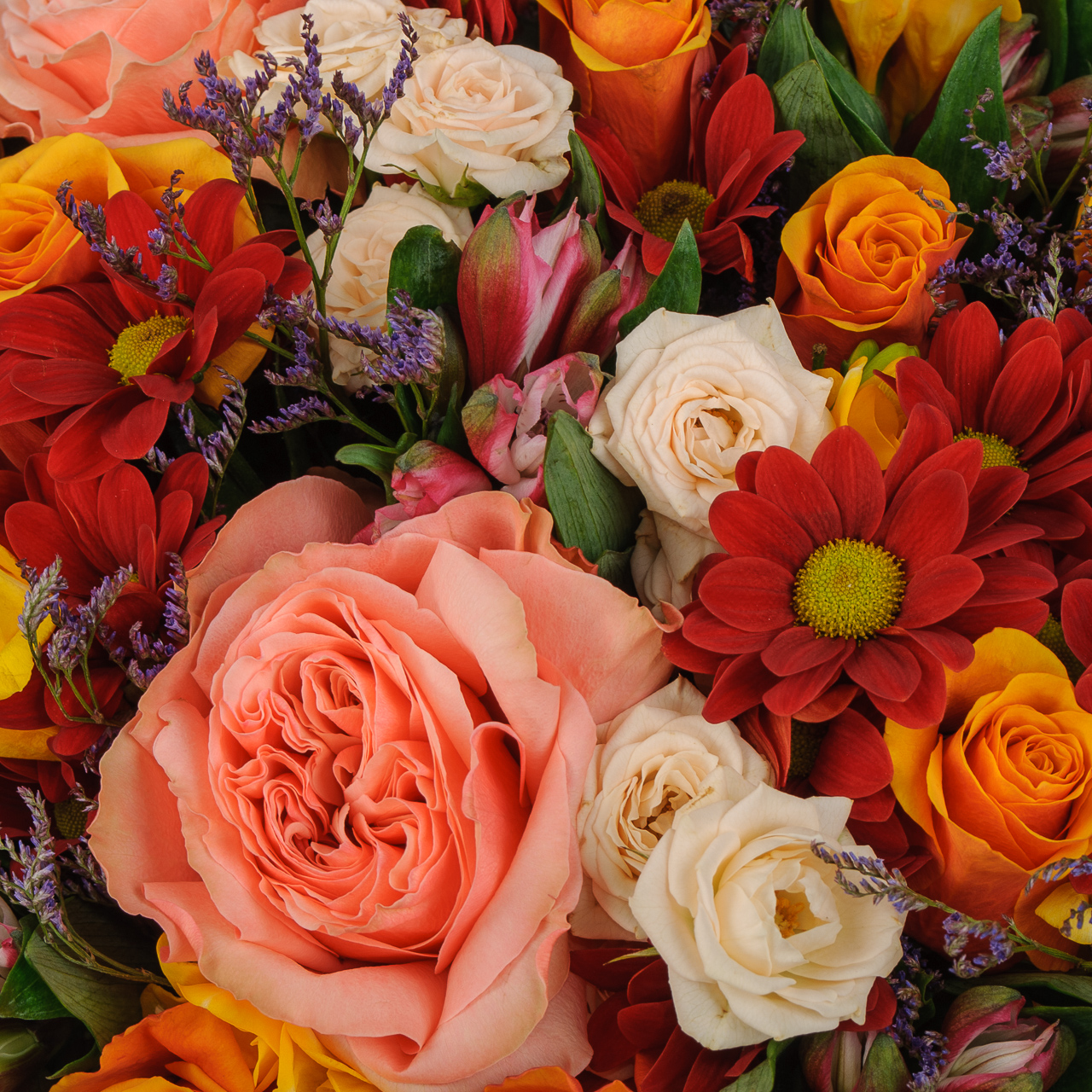 Яркий, многоцветный, полный жизни, несущий любовь и отличное настроение - таков этот прекрасный и пышный букет, который станет идеальным подарком для близких и любимых людей! Сочетание крапных розовых и огненно-рыжих роз с маленькими кустовыми розочками, бордовой хризантемой, красной альстромерией и декоративной зеленью выглядит очаровательно и нежно.