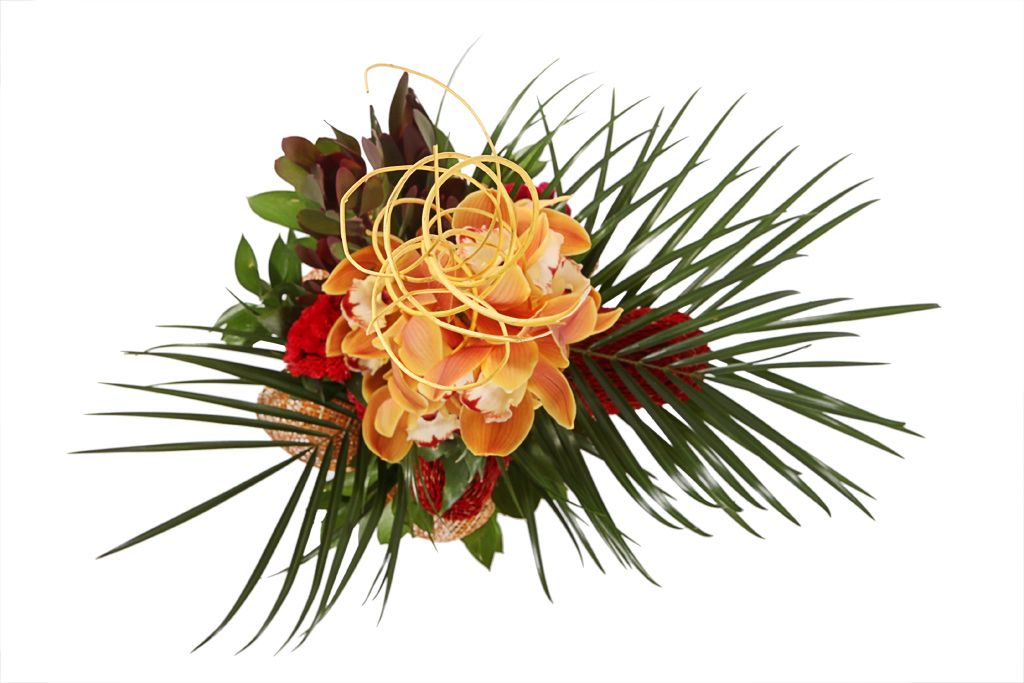 Роскошный вертикальный букет из экзотических банксий и изысканных орхидей – идеальный подарок, который одинаково понравится и подойдет и любимой женщине, и строгому руководителю. Острые пальмовые листья и красноватая зелень леукадендрона, декоративные высокие ветки добавляют цветочной композиции изысканности и делают ее уникальным и дорогим подарком.