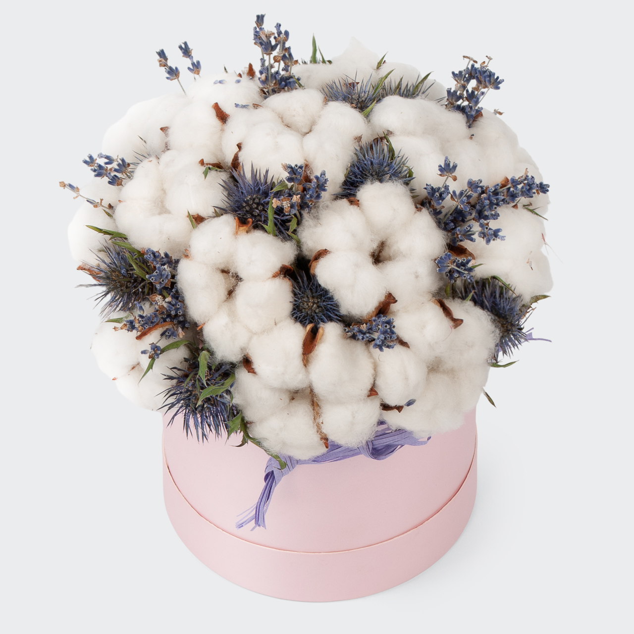 Сдержанная композиция из хлопка, ароматной лаванды и эрингиума в элегантном кашпо станет замечательным украшением интерьера и будет радовать взгляд долгое время!